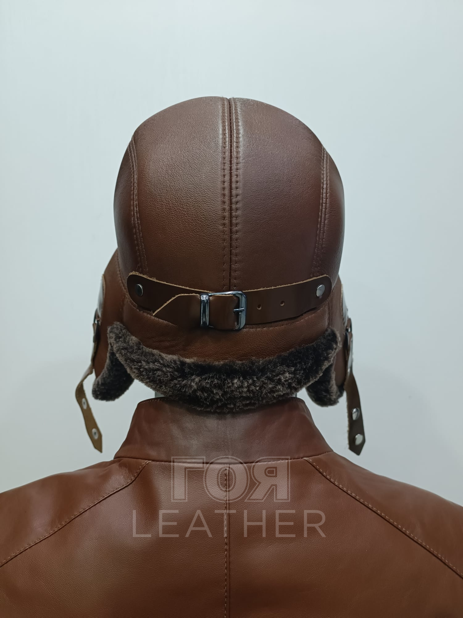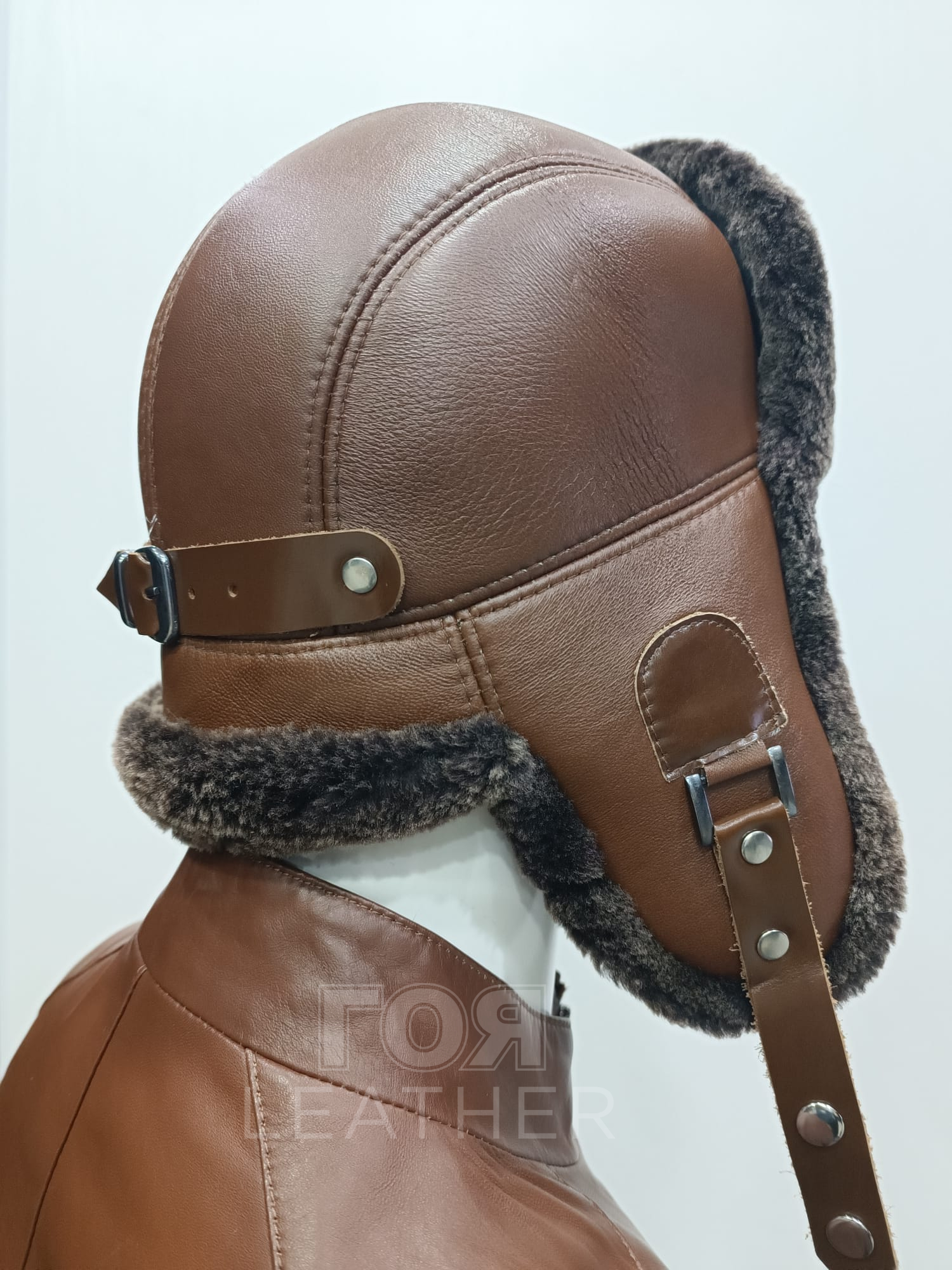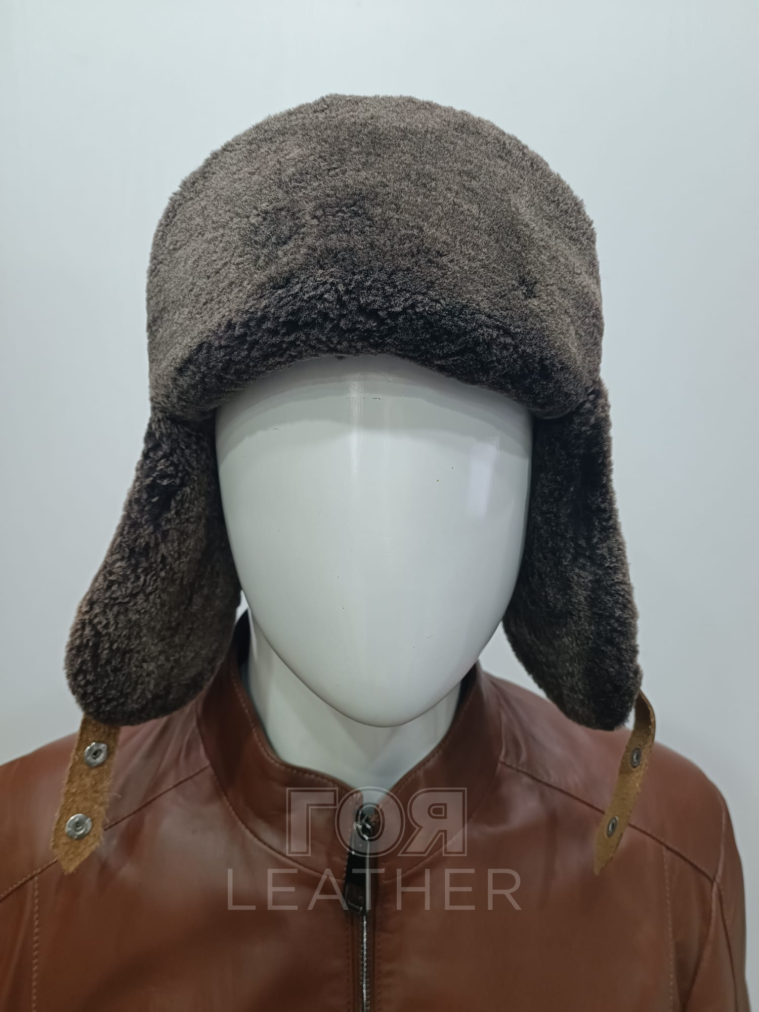 Кожена шапка ушанка, изработена от агнешка напа в цвят камел и агнешка тула-мутон тъмно кафяв. В задната част моделт разполага с катарама за корекция на обема. Моделът е подходящ и за мъже, и за жени.