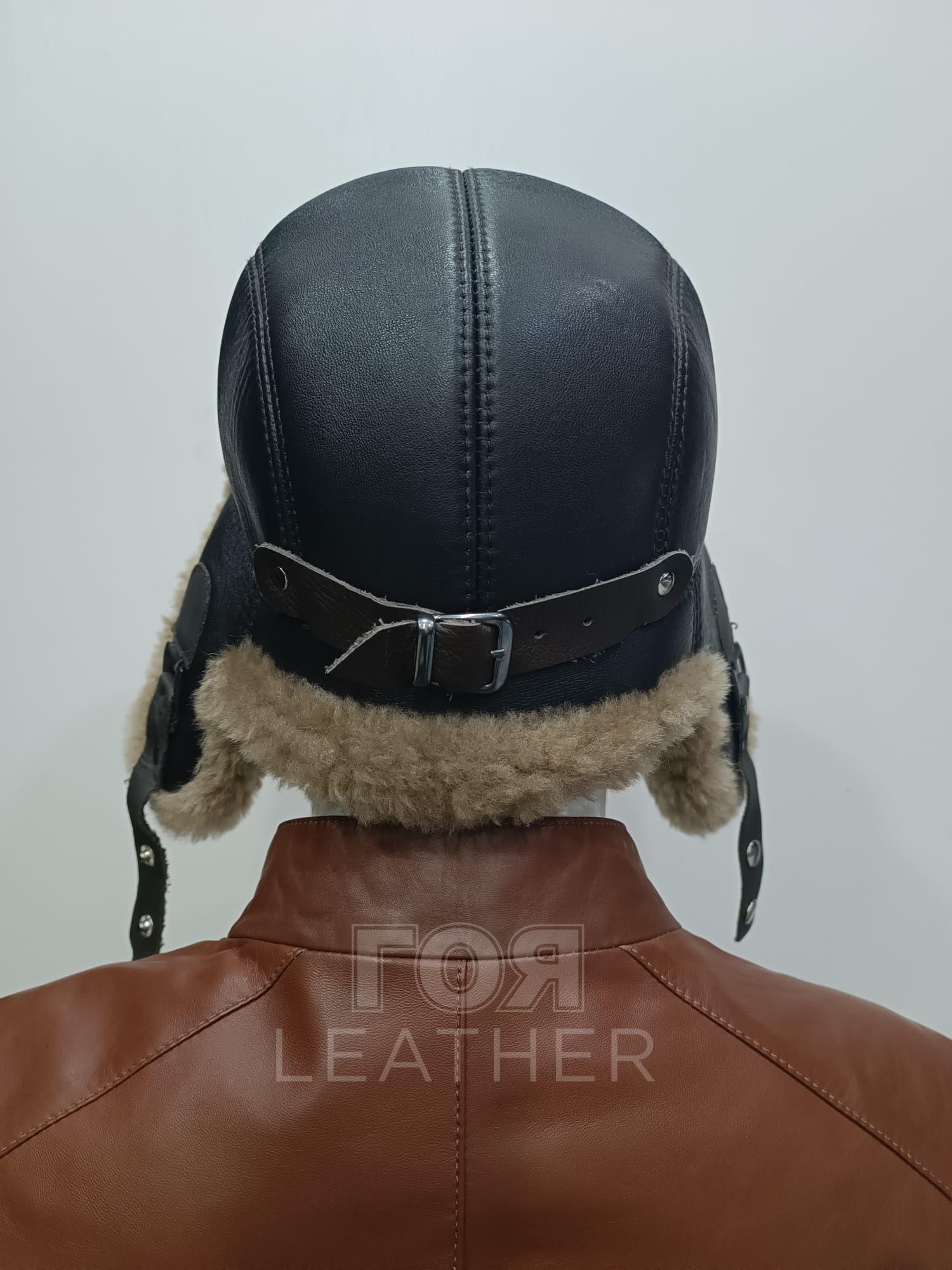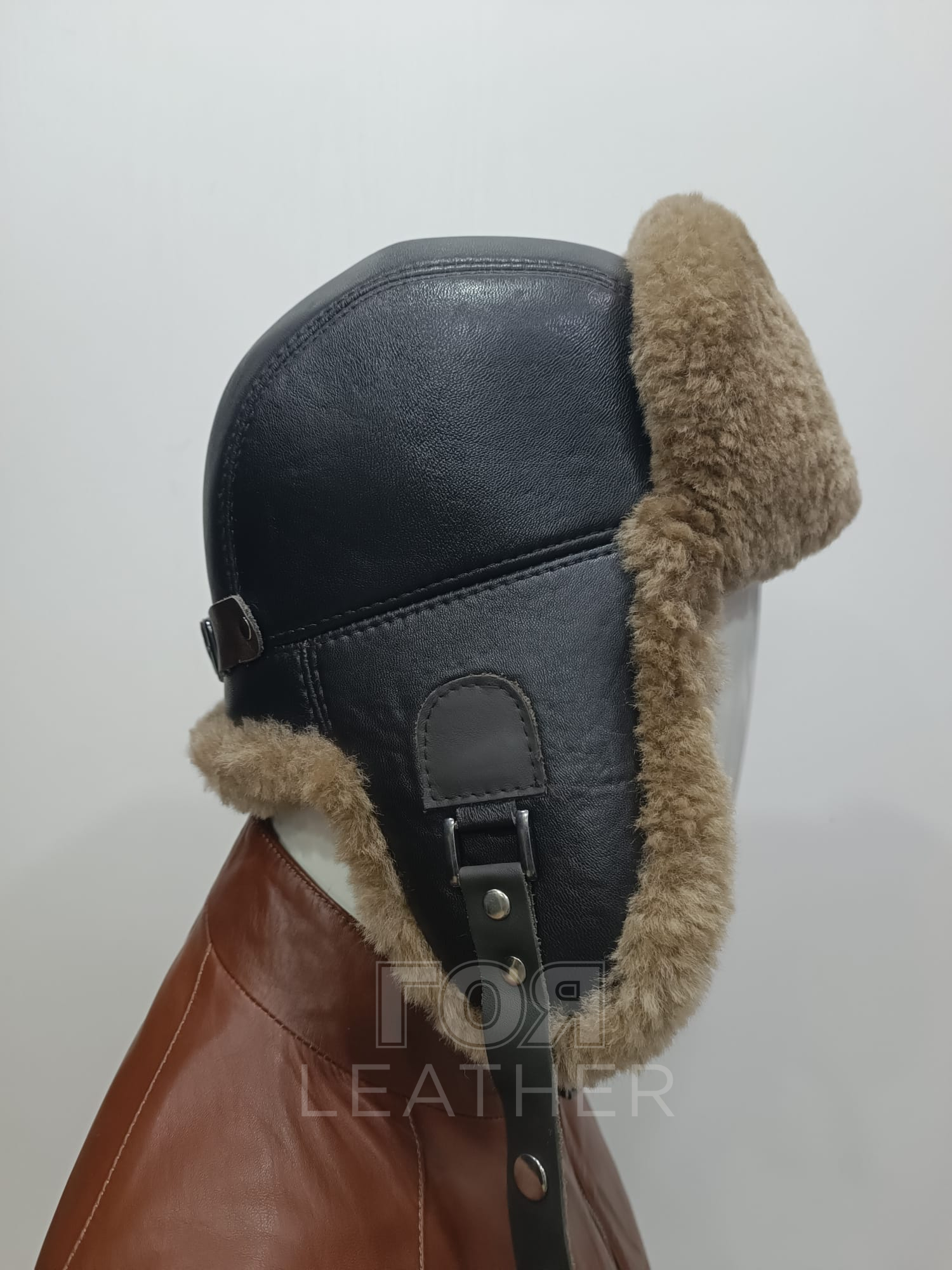 Кожена шапка ушанка, изработена от агнешка напа в тъмно кафяв цвят и агнешка тула-мутон в бежово. В задната част моделт разполага с катарама за корекция на обема. Моделът е подходящ и за мъже, и за жени.