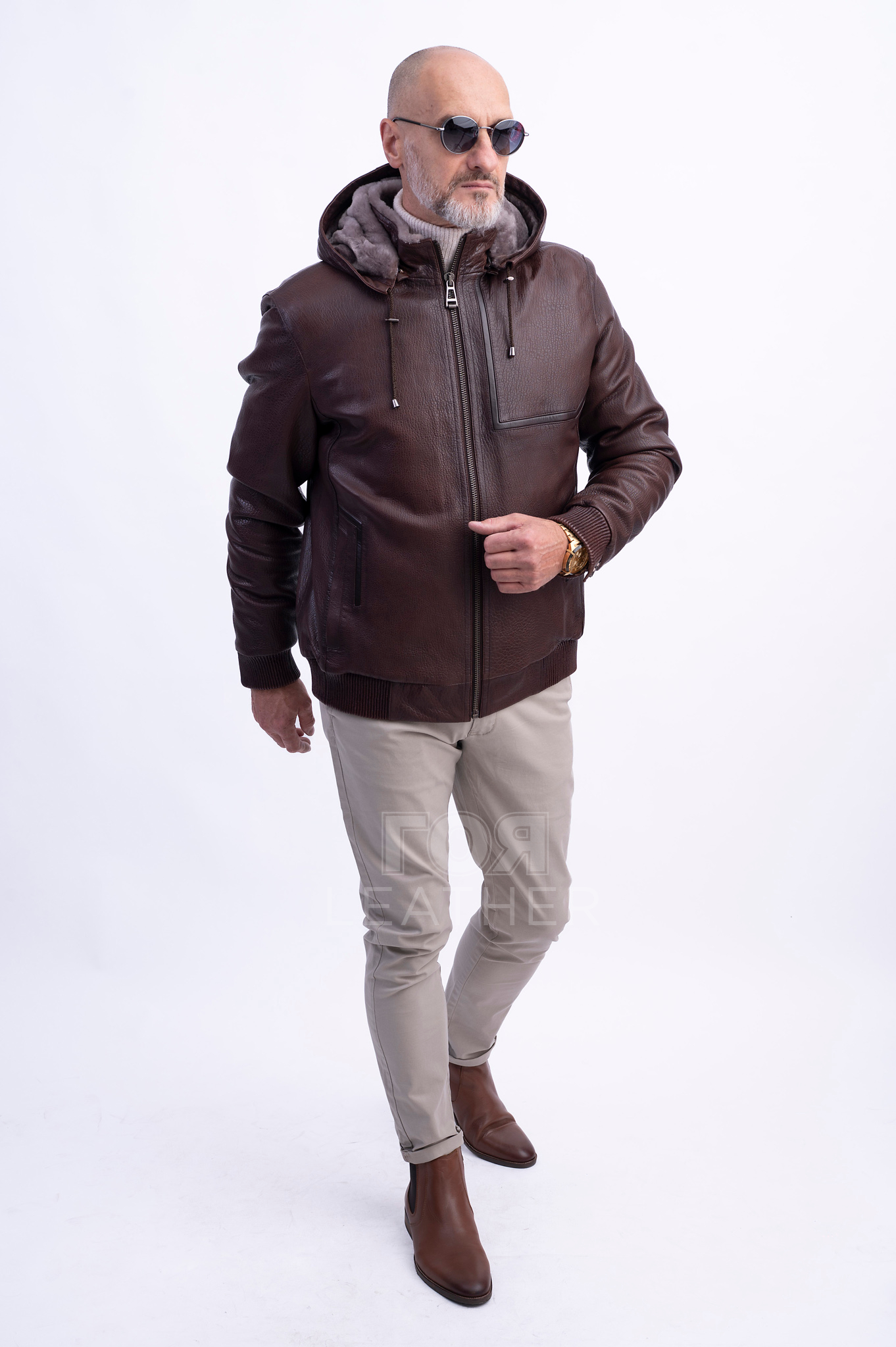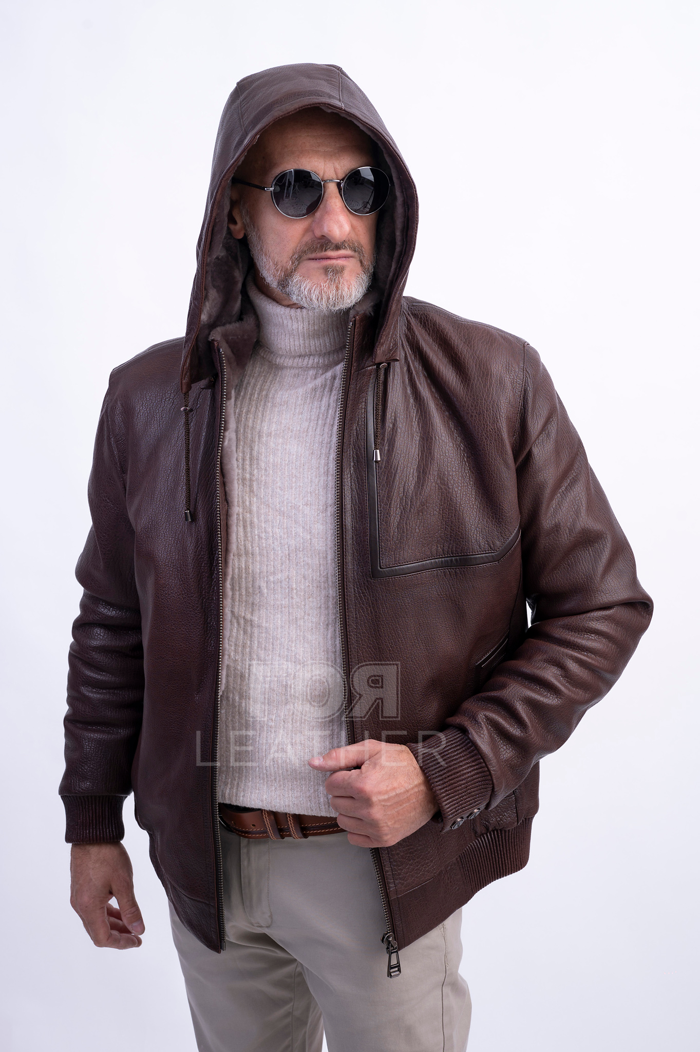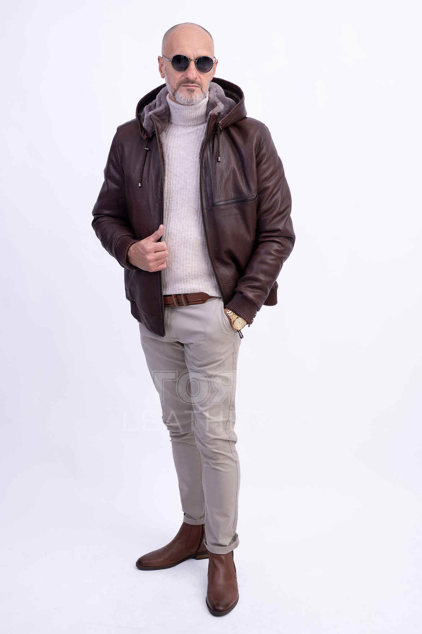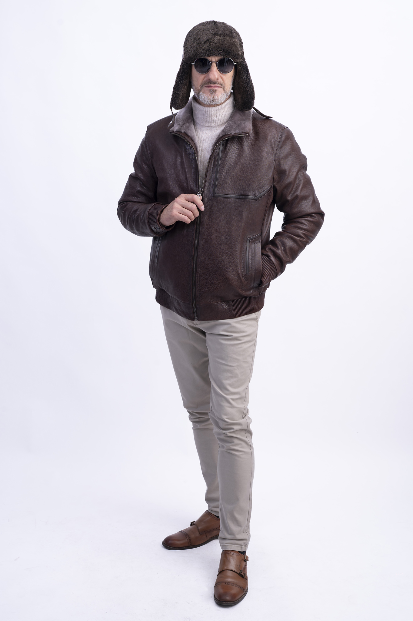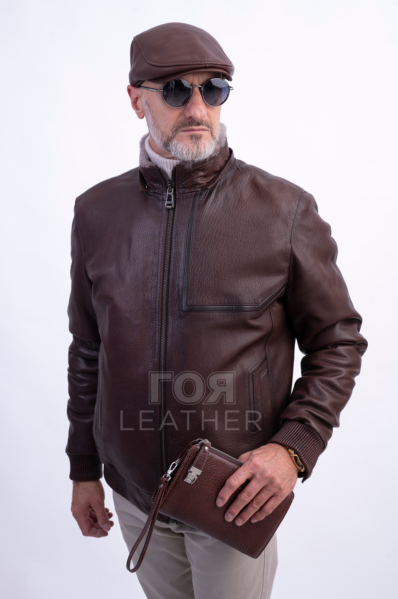 Този модел е изработен от висококачествена естествена кожа, с характерен релеф. Тя е  еластична и издръжлива. Коженото яке е удобно за носене и изобщо не ограничава движенията. Подплатата от овча кожа ви позволява да го носите при сравнително ниски температури. Якето е приятно на допир, много топло и уютно.