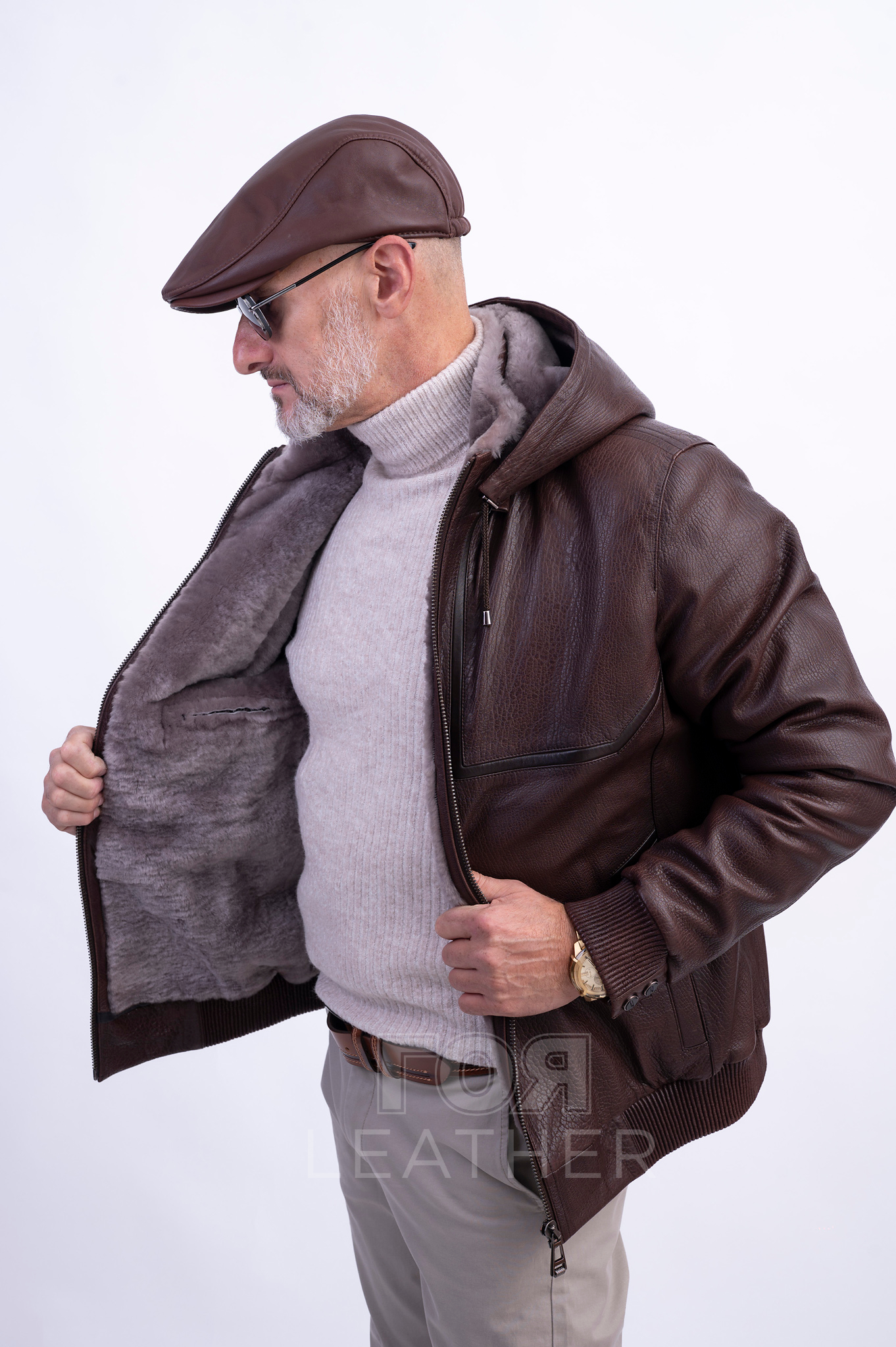 Якето има цип и стилни, просторни странични джобове. На разположение са и два вътрешни джоба. Моделът бомбър е с ластик изработен от кожа разположен и на ръкававите. Подвижната качулката също е подплатена с истинска овча кожа за допълнителен комфорт при ветровито време.
