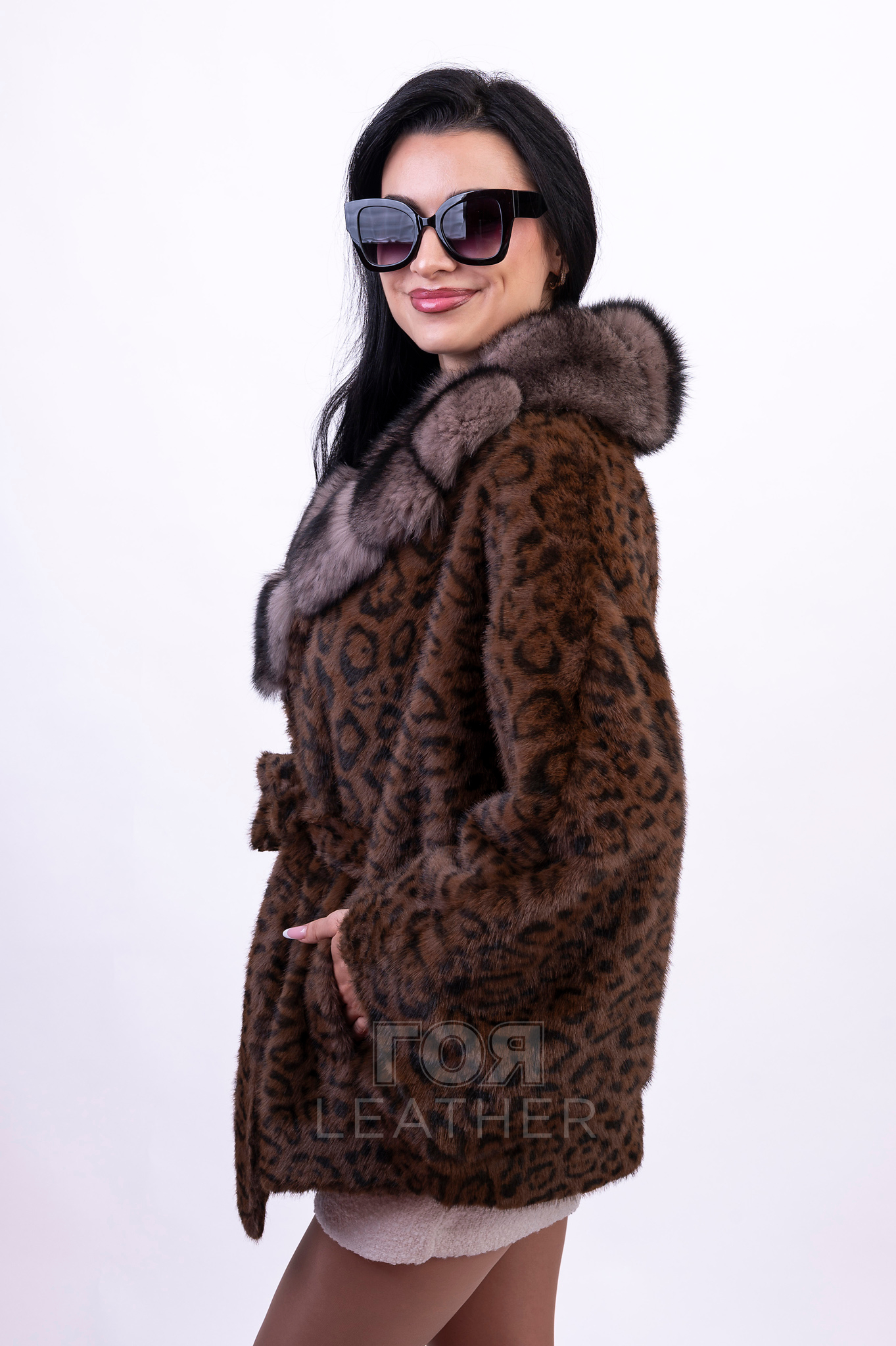 Материалът, избран за ушиване на продукта, е висококачествена еко кожа в кафяв принт леопард. Материалът е мек, има привлекателен външен вид и при носене дава приятно усещане за лекота. Друго предимство на този модел е достъпната му цена, като качеството на изделието по никакъв начин не отстъпва на естествените.
